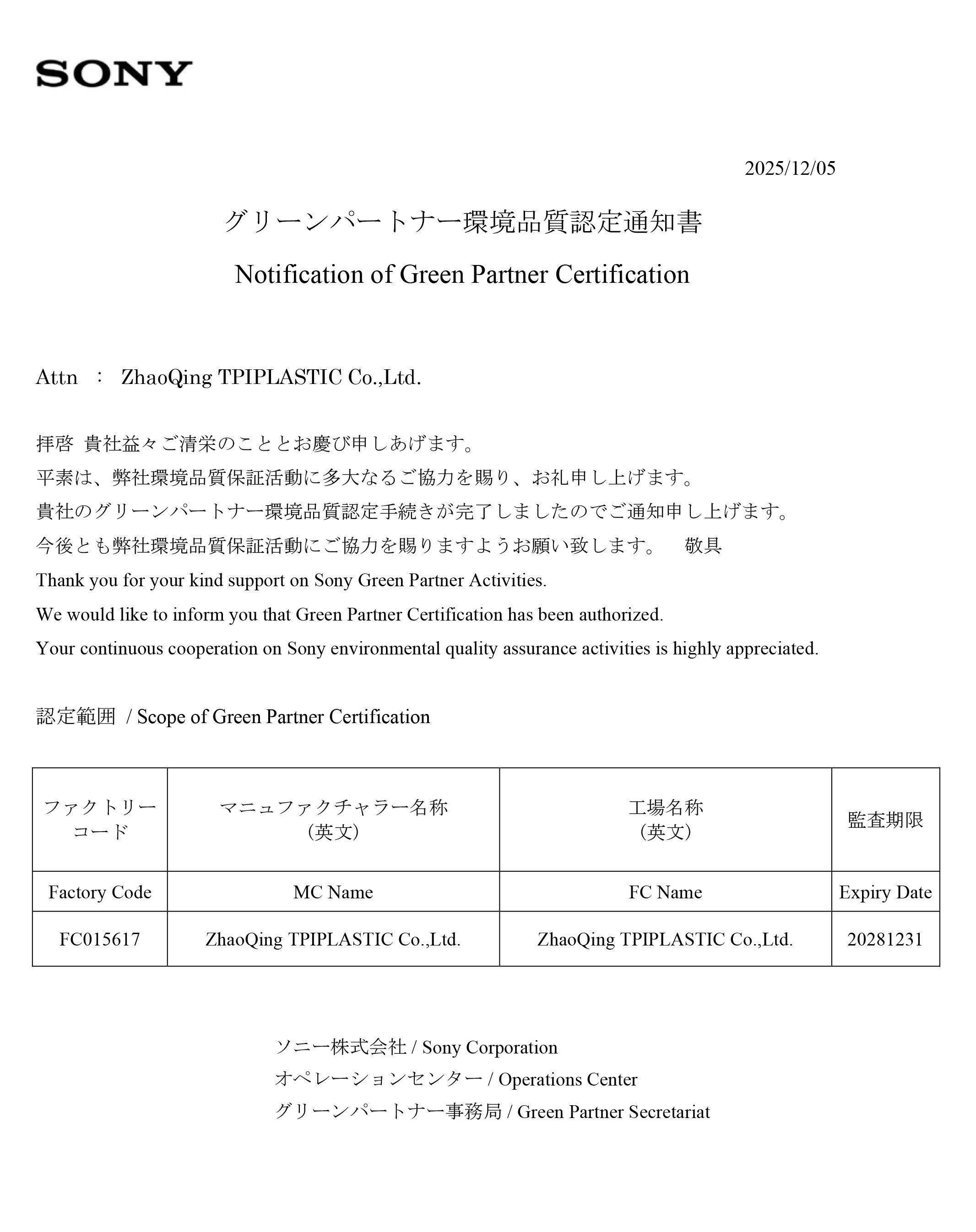 TPIPLASTIC is proud to announce that it has officially obtained the Sony Green Partner Certification, recognizing the company’s strong commitment to environmental responsibility, chemical substance management, and sustainable manufacturing practices.
